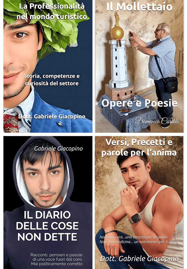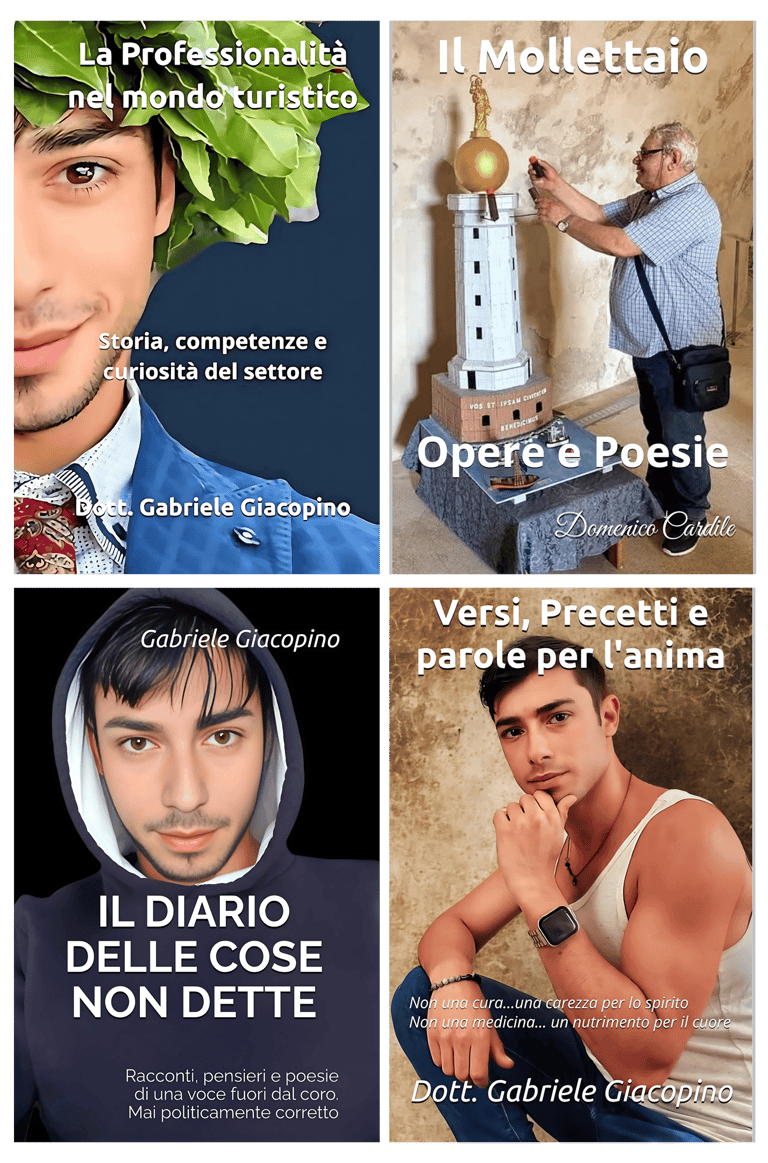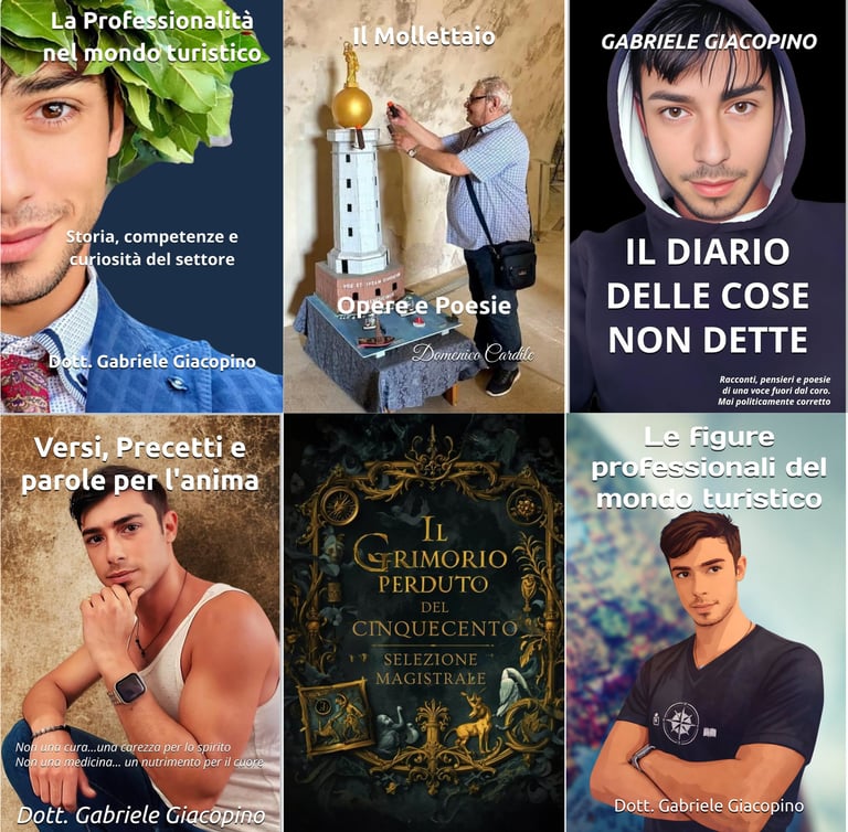 Collezione esclusiva di 4 libri CARTACEI firmati Gabriele Giacopino, questa selezione unica comprende quattro volumi straordinari che spaziano dalla professionalità nel turismo alla poesia, passando per profonde riflessioni personali e versi.
